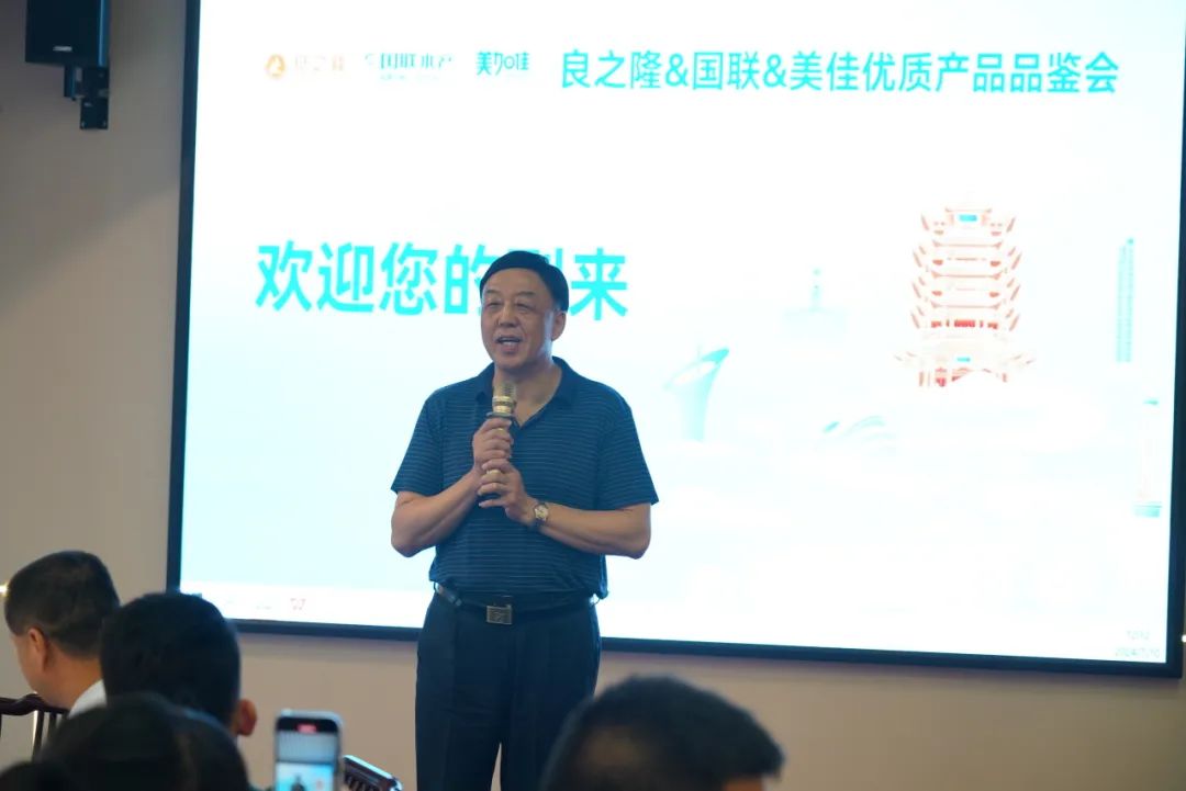 在参观结束后,嘉宾陆续入座。由王海东大师致开场辞;随后国联水产重客部总监张立、大客户部经理韩超娴;山东美佳武汉分销中心王忠阳分别代表厂家做主题分享和政策揭晓。让客户更直观的了解到了产品的养殖、加工等环节,从而放心备货,使用安心。